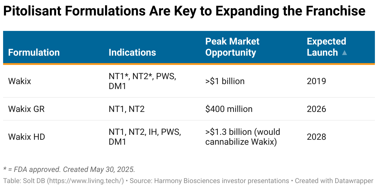 Wakix is approved for both NT1 and NT2 in both children and adults. In February 2025, it was rejected as a treatment for IH due to a poor study design, but Harmony Biosciences expects to take another crack at the opportunity with Wakix HD.