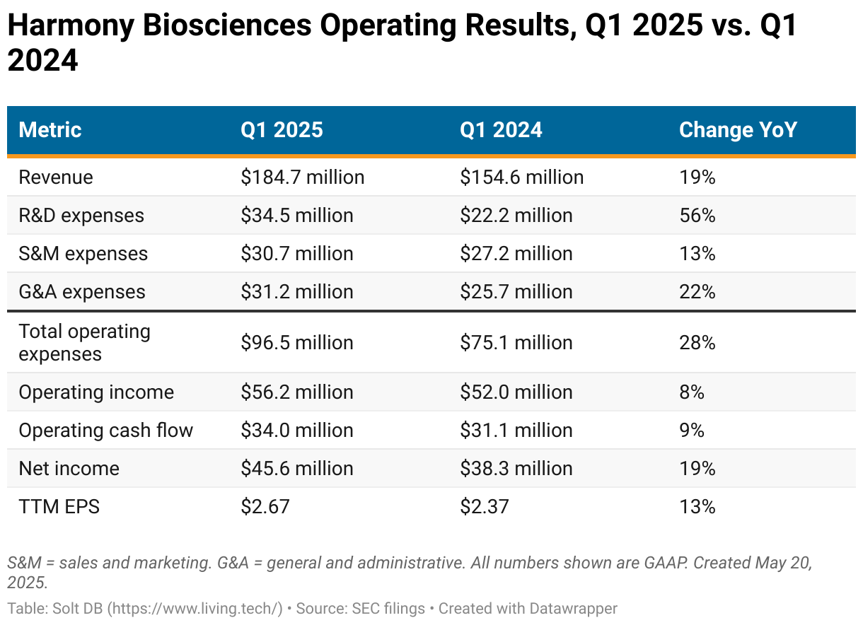 Harmony Biosciences is objectively a strong business, even if it is fully dependent on a single product. The company grew Wakix revenue to $184 million in the first quarter of 2025, up 19% from the year-ago period. Full-year 2025 revenue guidance expects $840 million at the midpoint, representing annual growth of 20%. I model slightly less.