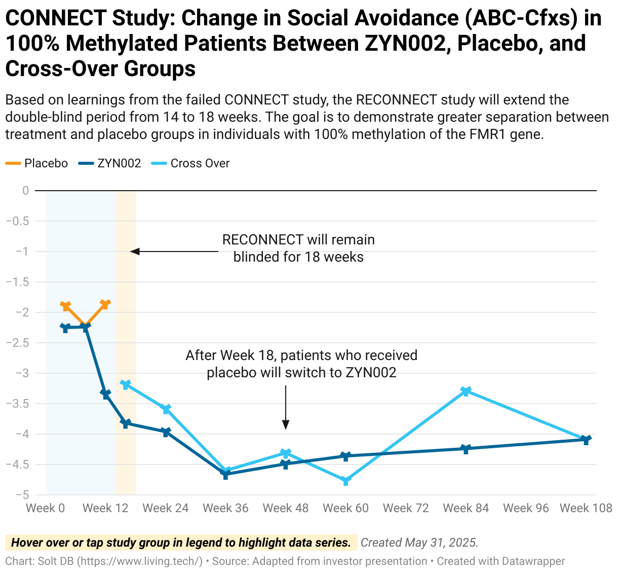 - If patients in the ZYN002 group (dark blue) show deepening responses through Week 18, then the fourth data point would be in the ballpark of -3.0 to -4.0. This would roughly match observations from the CONNECT study and look similar to the chart below.