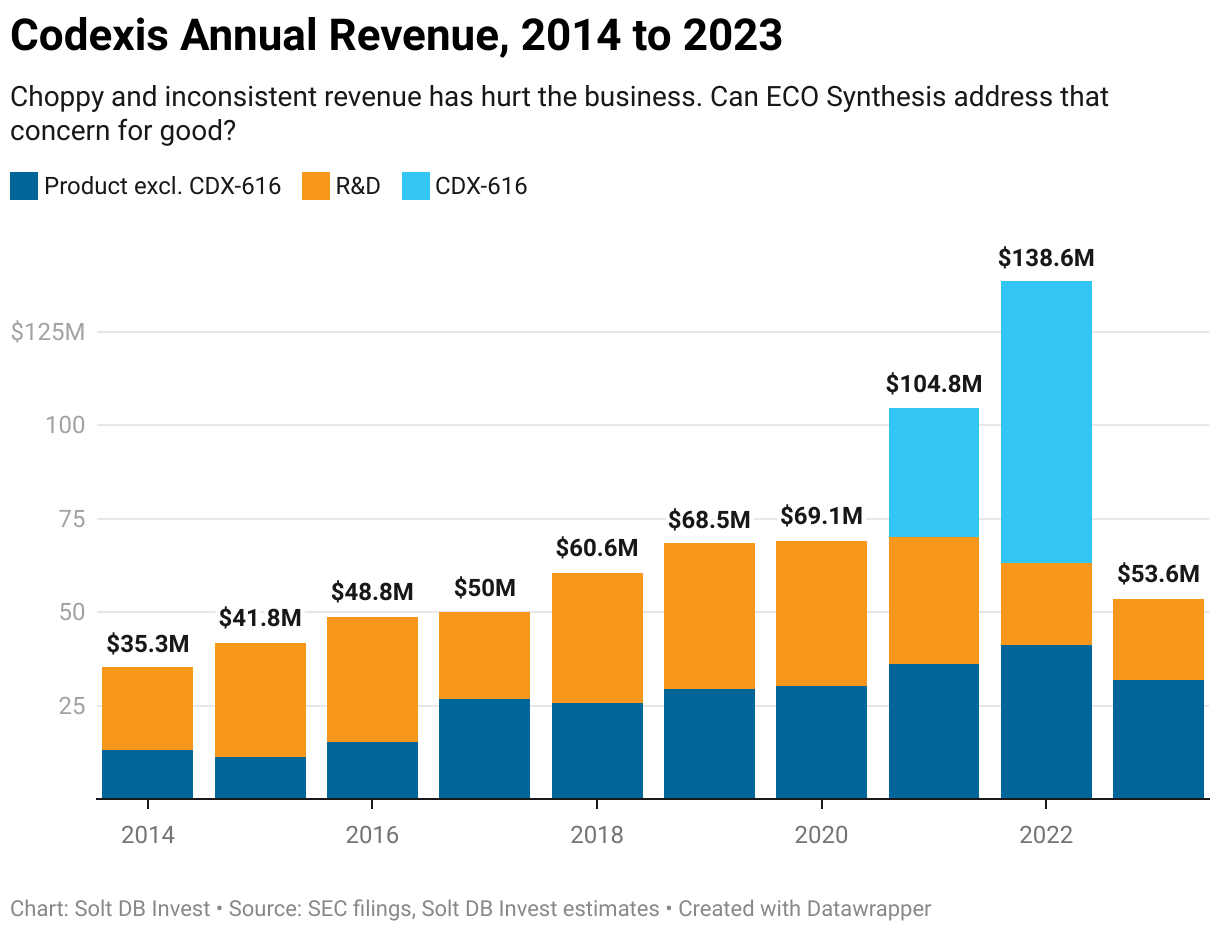 Codexis has struggled to generate consistent or meaningful revenue from its pharma enzyme business, since customers typically only make one or two orders each year for their entire manufacturing footprint. The "meaningful" problem was addressed when the business developed CDX-616, an enzyme used to manufacture Paxlovid from Pfizer, but fading demand for coronavirus medicines meant the "consistent" problem remained.